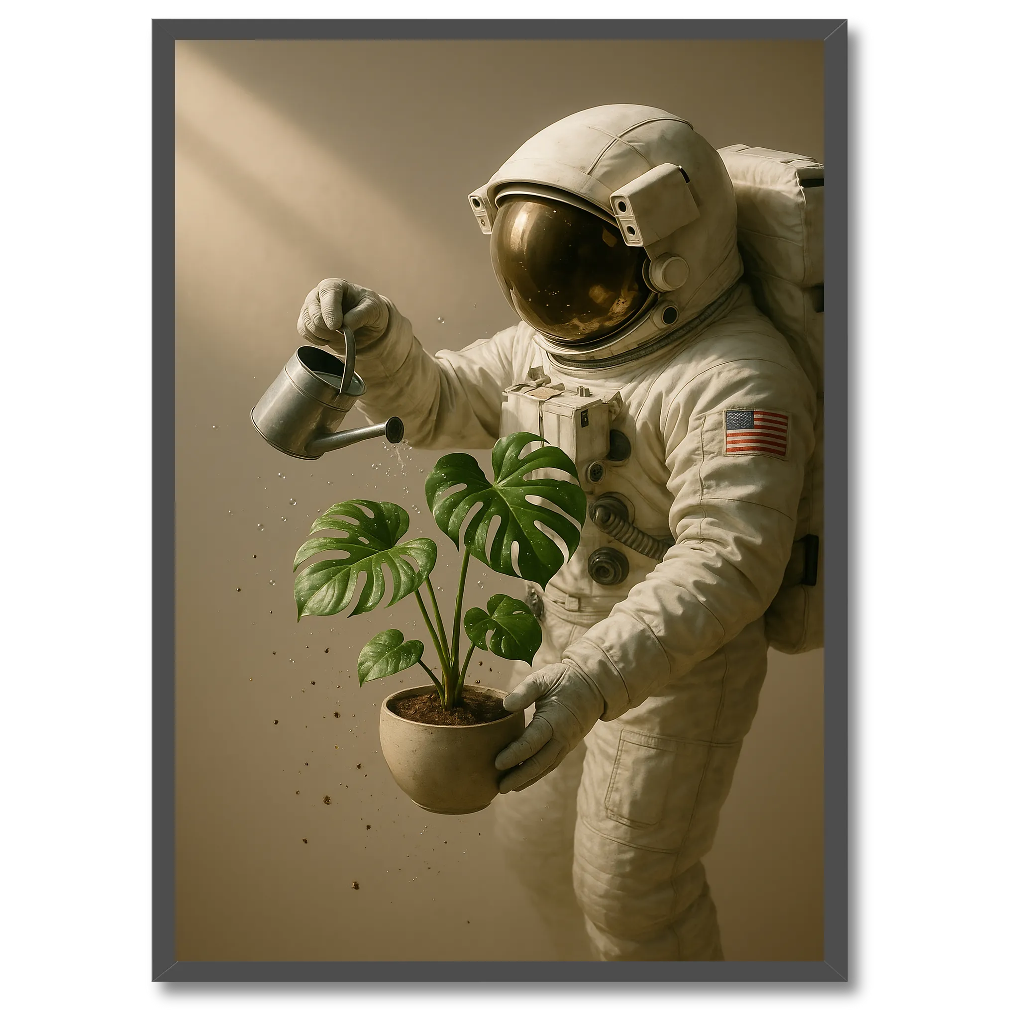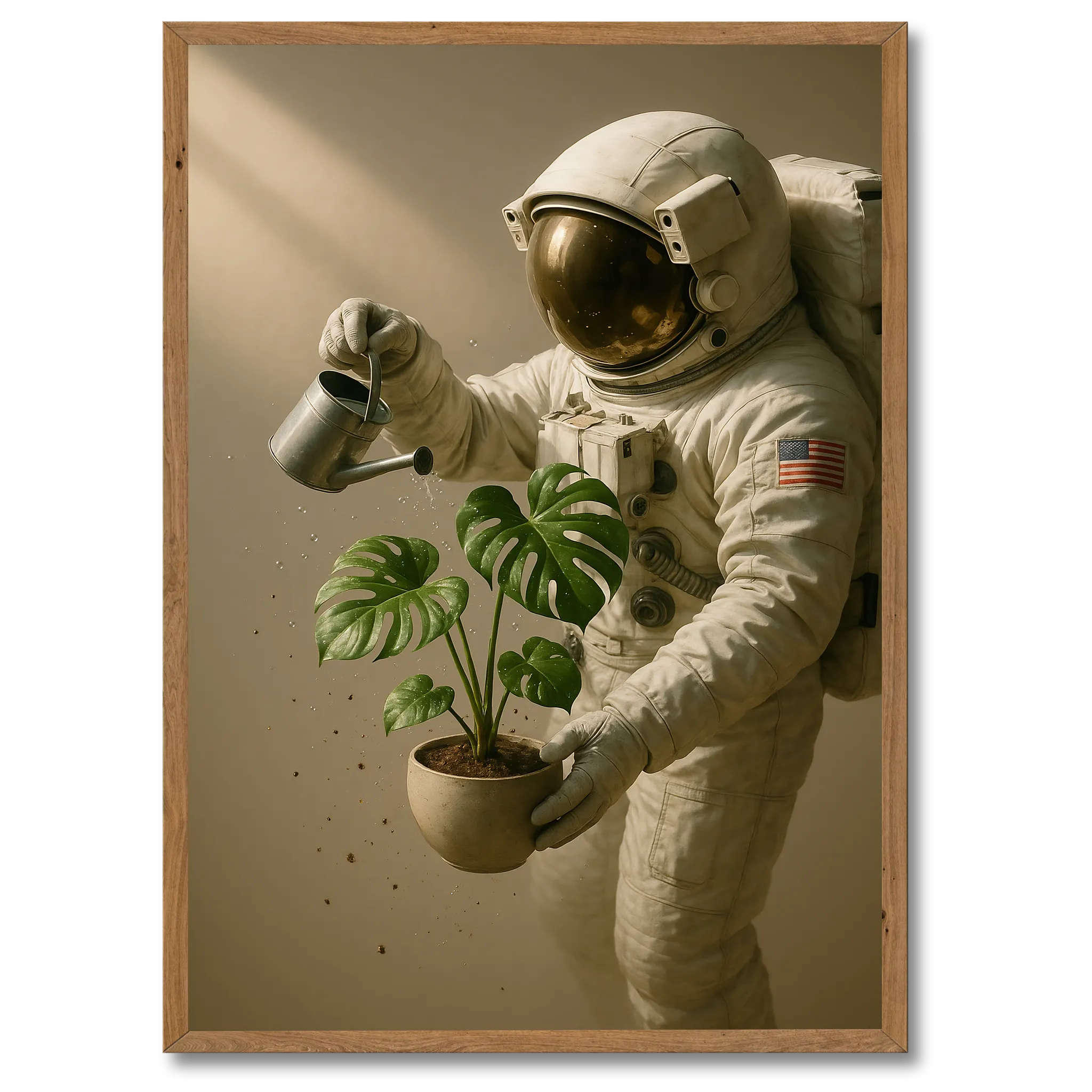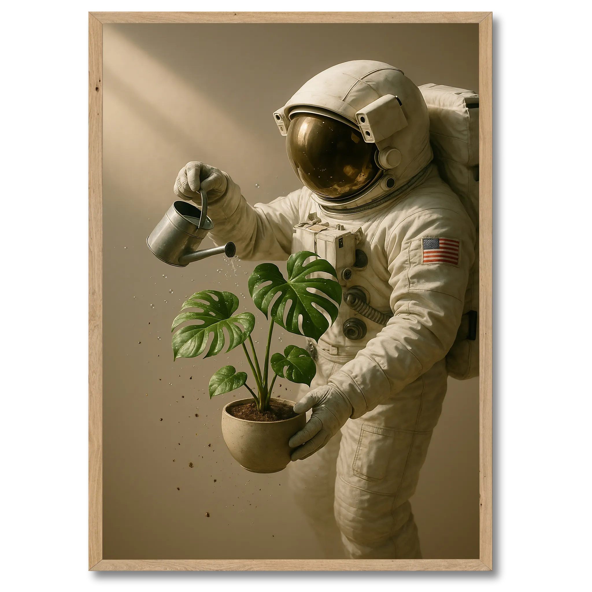 Astronaut planter plakat er en af de plakater, der får dig til at stoppe op og smile. Motivet viser en astronaut i fuld rumdragt, der står midt i et fremmed landskab og vander en lille grøn plante. Det er både humoristisk og tankevækkende – en kombination af teknologi og natur, af menneskets udforskningstrang og vores behov for at passe på livet omkring os. Resultatet er en plakat, der skaber samtale og giver et unikt præg til din indretning.