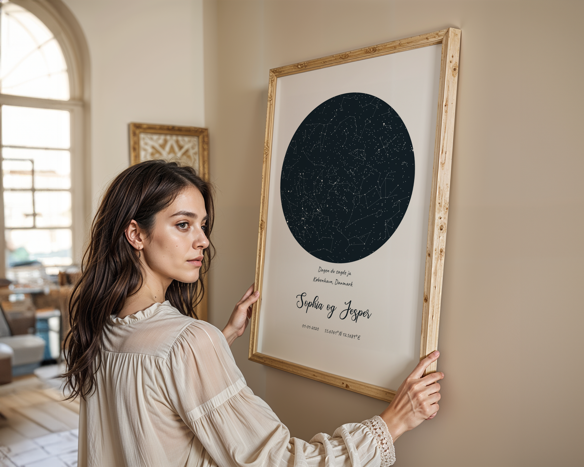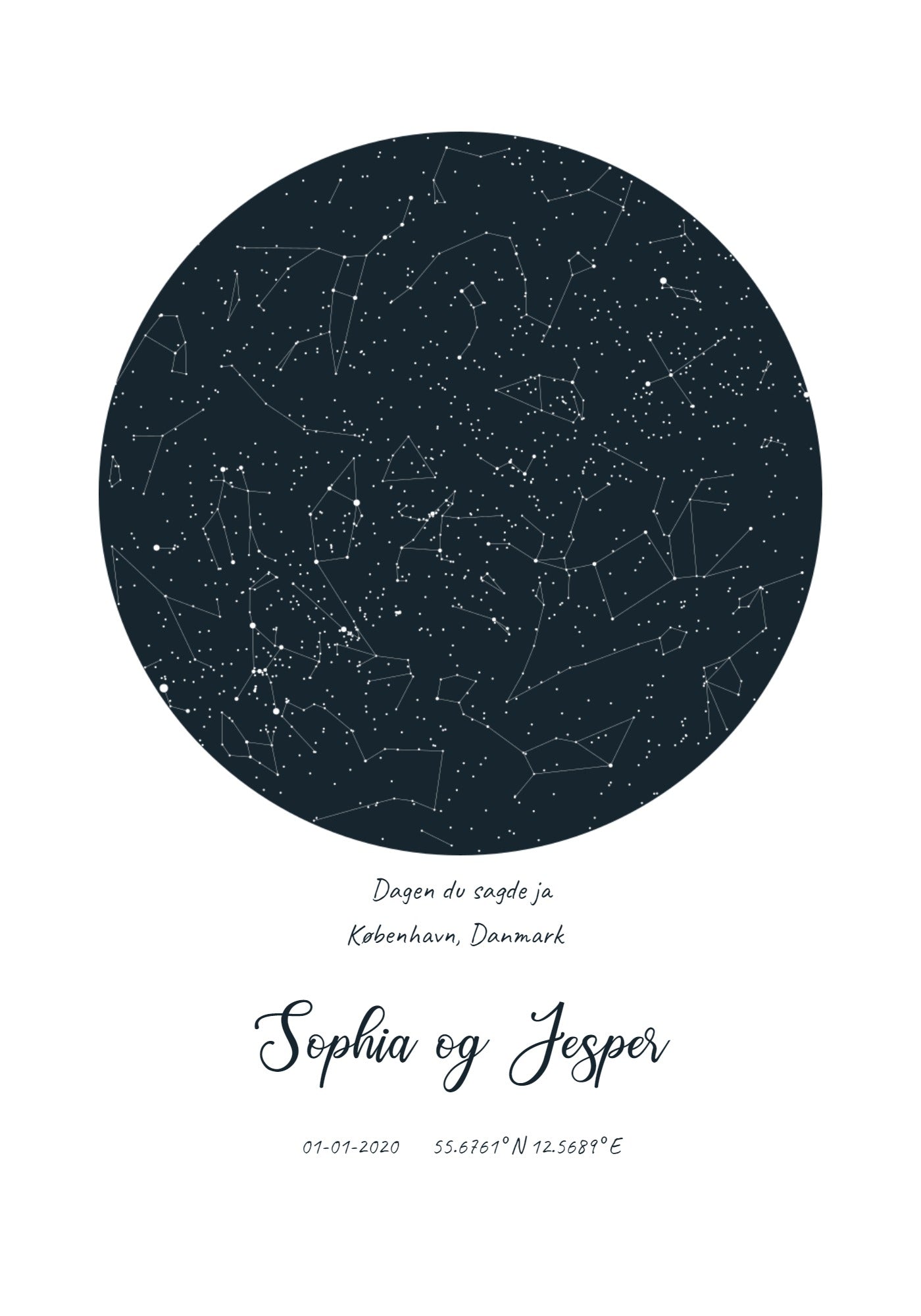 Med vores stjerneplakat med former kan du skabe en helt unik plakat. Med vores lette og intuitive editor har du mulighed for at vælge et hvilket som helst sted i verden og en dato. Den vil herefter vise stjernerne som de stod på det valgte sted netop den specifikke dato. Du har endvidere mulighed for at vælge former og farver på stjernekortet. Samtidig kan du sætte den specielle anledning, jeres navne osv. ind.