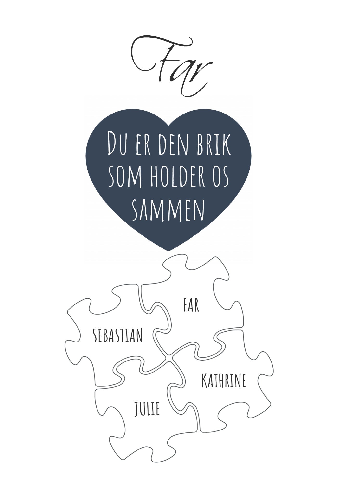 Lav en unik og meningsfuld gave med vores personlige plakat med puslespilsbrikker. Den har en hjertevarmende overskrift med modtagerens navn og et hjerte, der siger "Du er den brik som holder os sammen." Nedenunder finder du tilpasningsbare puslespilsbrikker med navne på de personer, der betyder mest for modtageren. Denne smukke og moderne plakat passer perfekt ind i ethvert hjem eller kontor. Puslespilsbrikkerne symboliserer sammenholdet mellem mennesker.