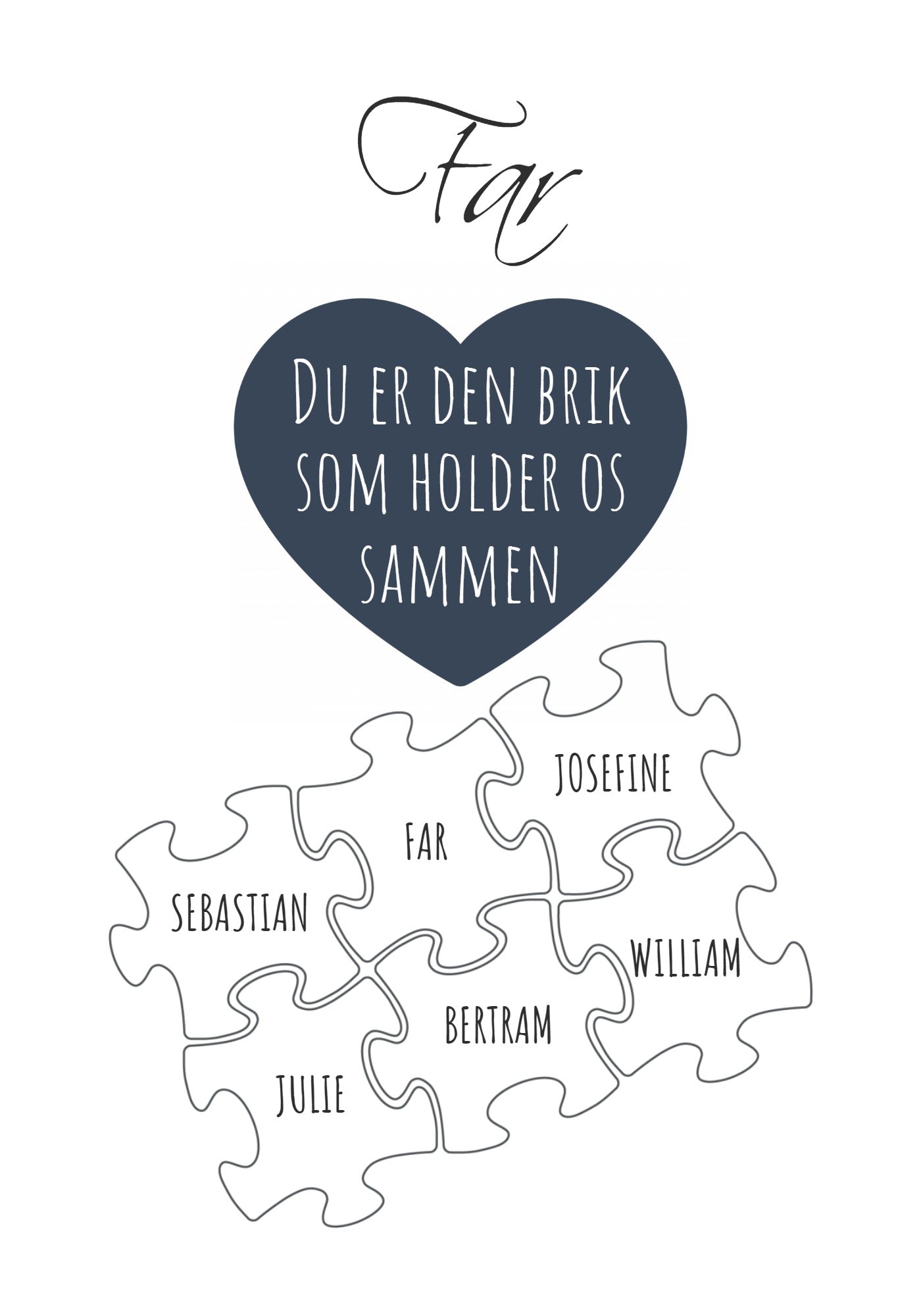 Lav en unik og meningsfuld gave med vores personlige plakat med puslespilsbrikker. Den har en hjertevarmende overskrift med modtagerens navn og et hjerte, der siger "Du er den brik som holder os sammen." Nedenunder finder du tilpasningsbare puslespilsbrikker med navne på de personer, der betyder mest for modtageren. Denne smukke og moderne plakat passer perfekt ind i ethvert hjem eller kontor. Puslespilsbrikkerne symboliserer sammenholdet mellem mennesker.