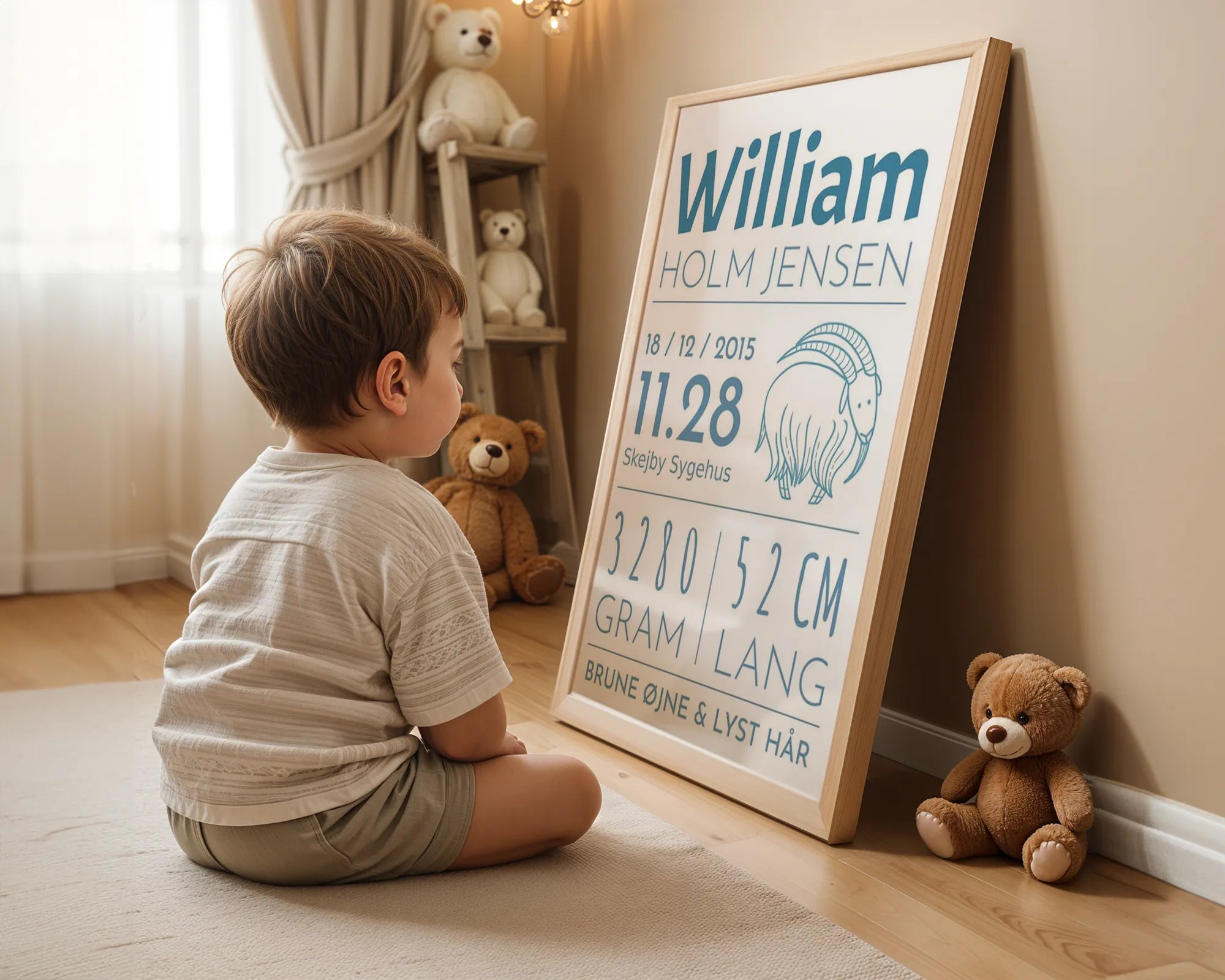 En fødselsplakat som denne er ikke bare en dekorativ tilføjelse til hjemmet, men også et varigt minde om en af livets største begivenheder. Den perfekte kombination af fakta og æstetik gør denne plakat til et oplagt valg, når du vil tilføje et personligt touch til indretningen.