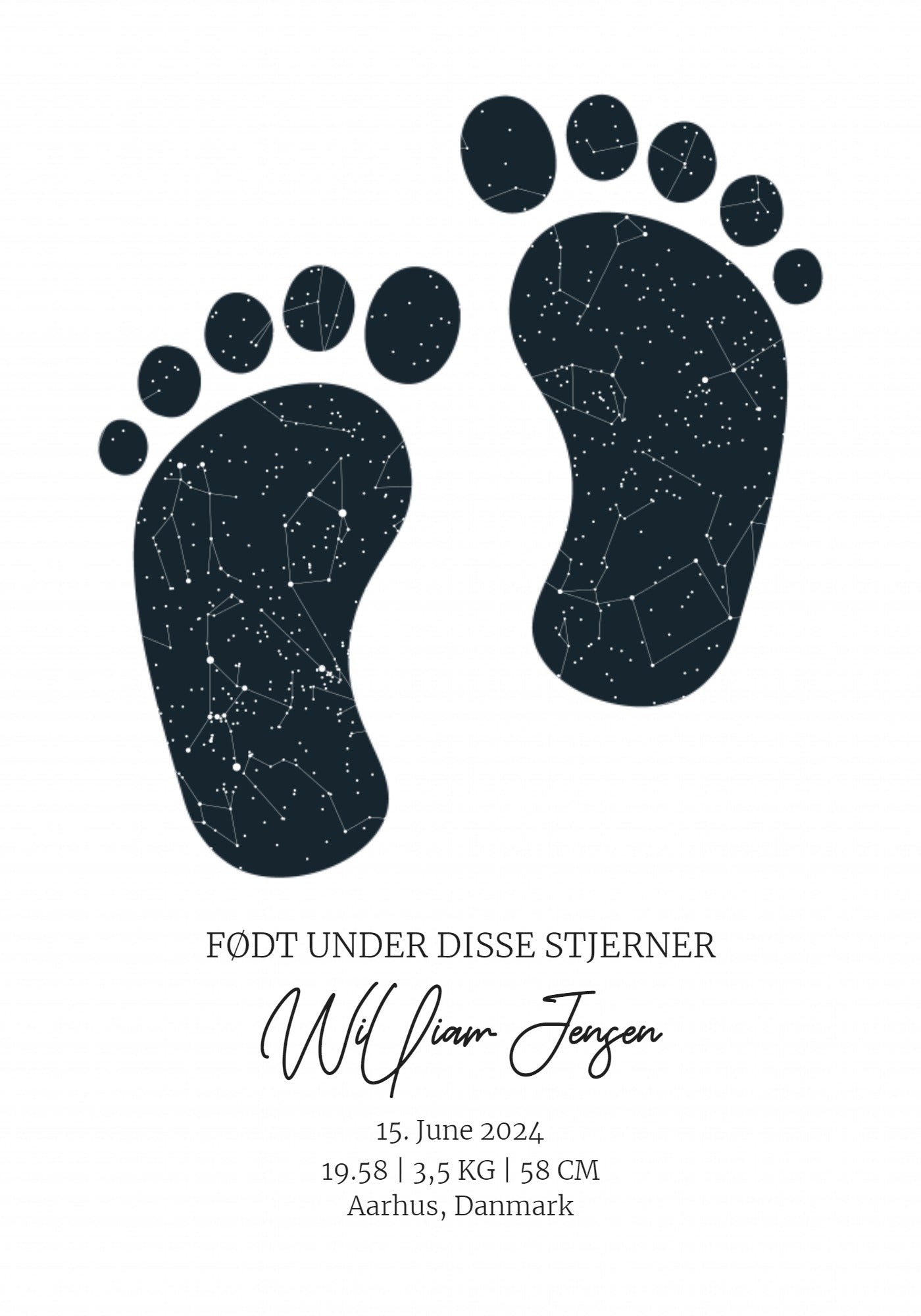 Med Footprint Stjernehimmel Plakat har du fuld kontrol over designet, så du kan gøre det til noget helt personligt. Du vælger den specifikke dag og sted, hvor dit barn blev født, og din plakat vil vise stjernebilledet præcist, som det så ud den nat. Dette gør plakaten til mere end blot en dekoration – det bliver et vidnesbyrd om det smukke øjeblik, dit barn kom til verden.