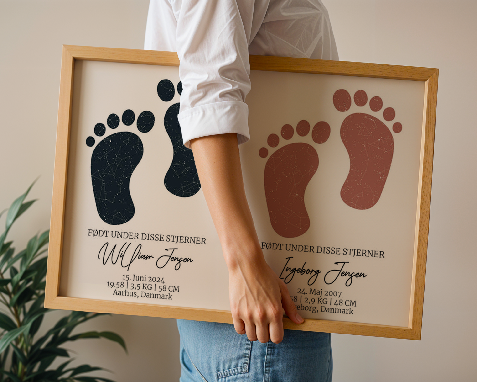 Forevig to særlige øjeblikke med vores footprints stjernehimmel dobbelt plakat. Skab en personlig og smuk stjernehimmel plakat, der kombinerer stjernernes placeringer og unikke fodaftryk, og lad den pryde dine vægge som et evigt minde. Bestil din stjernebillede plakat i dag og gør dine minder til et kunstværk.