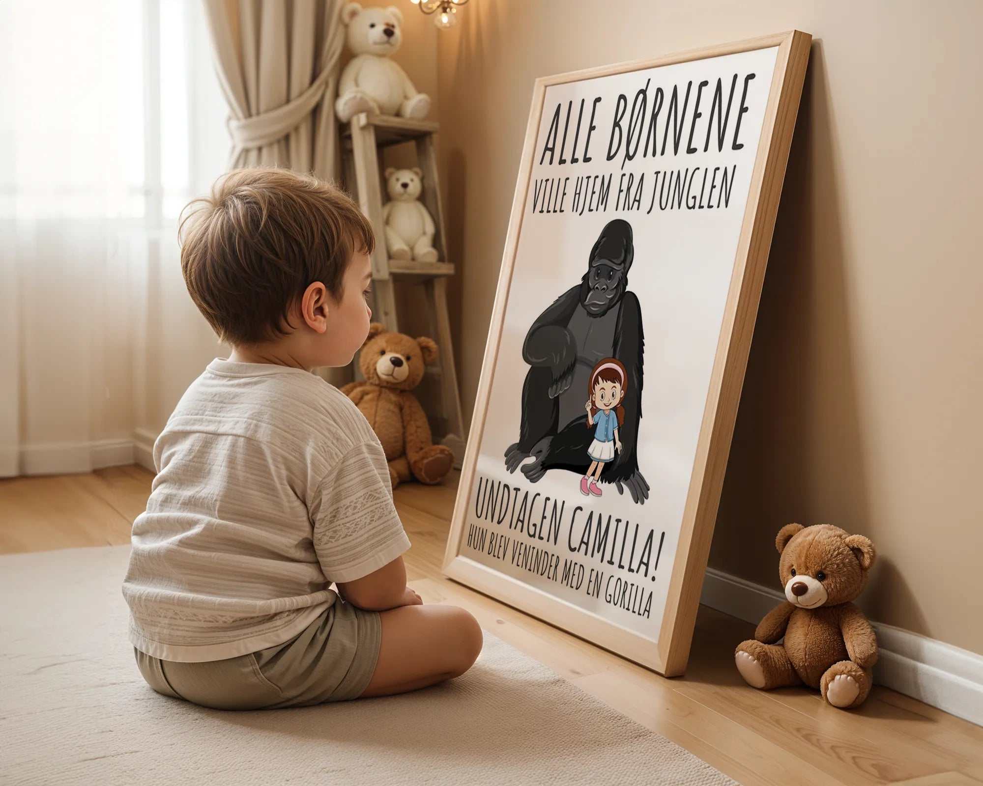 Her får du en sød og sjov plakat med en af de velkendte "Alle børnene" jokes formuleret på en sød og venlig måde med en rigtig sød tegning til. Her er det Camilla som ikke vil med hjem fra jungletur, fordi hun er blevet gode veninder med en gorilla.
