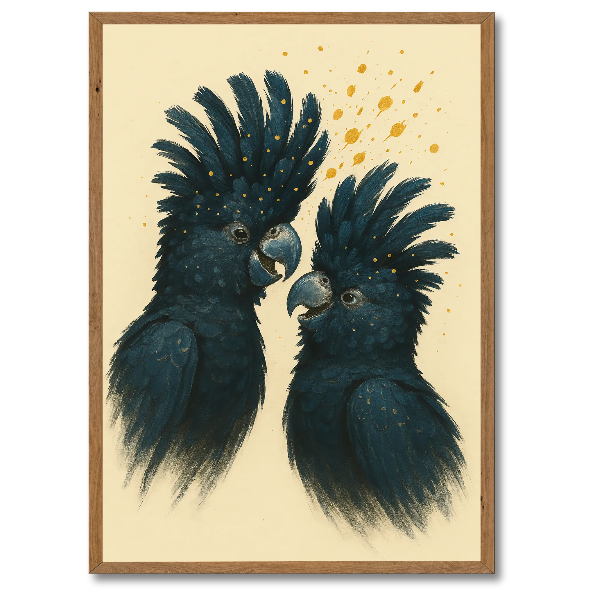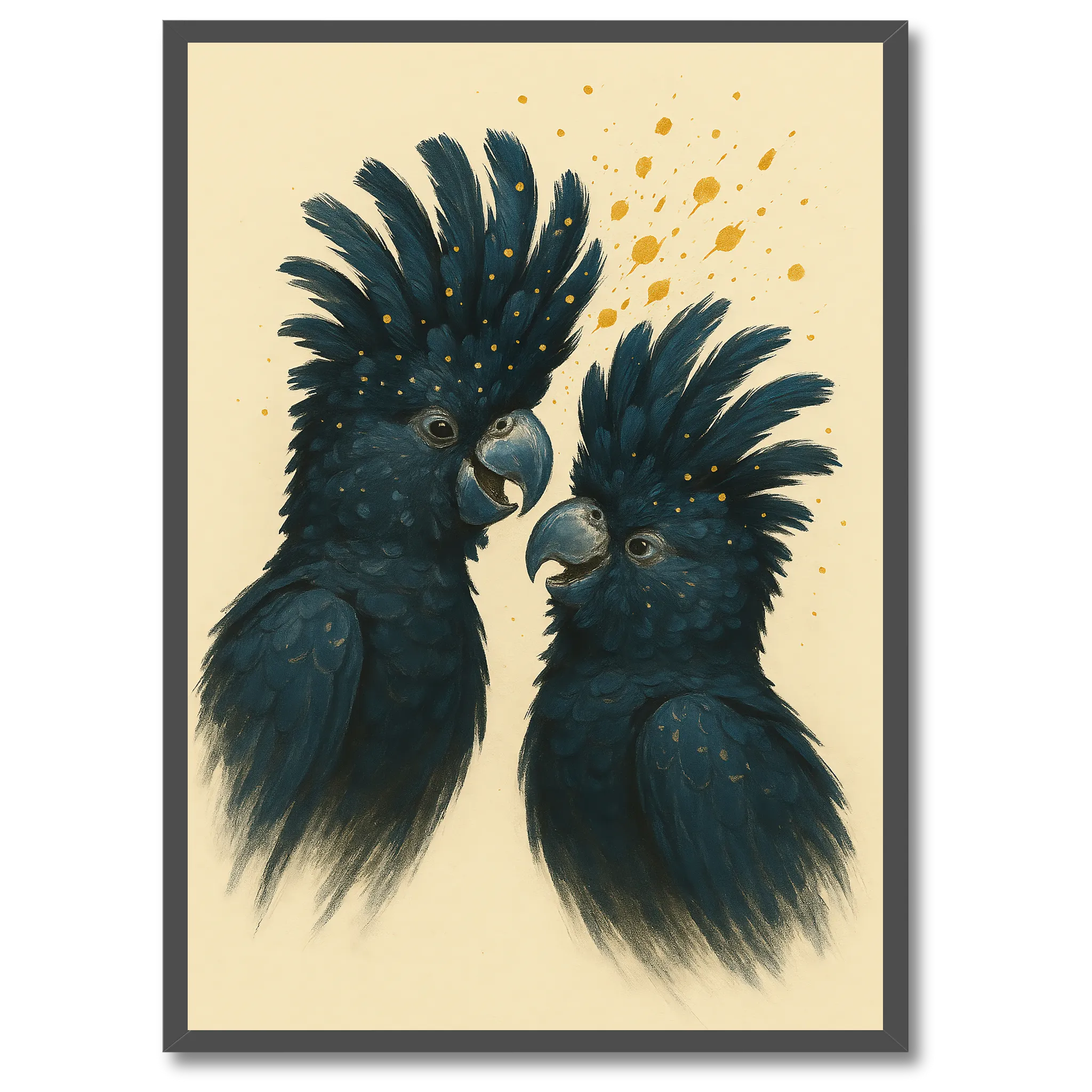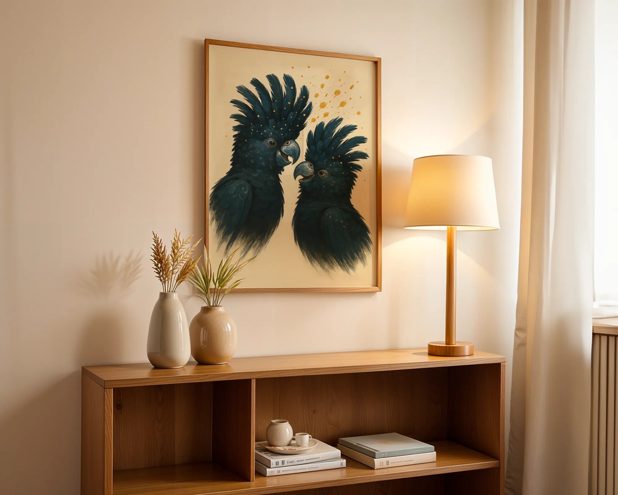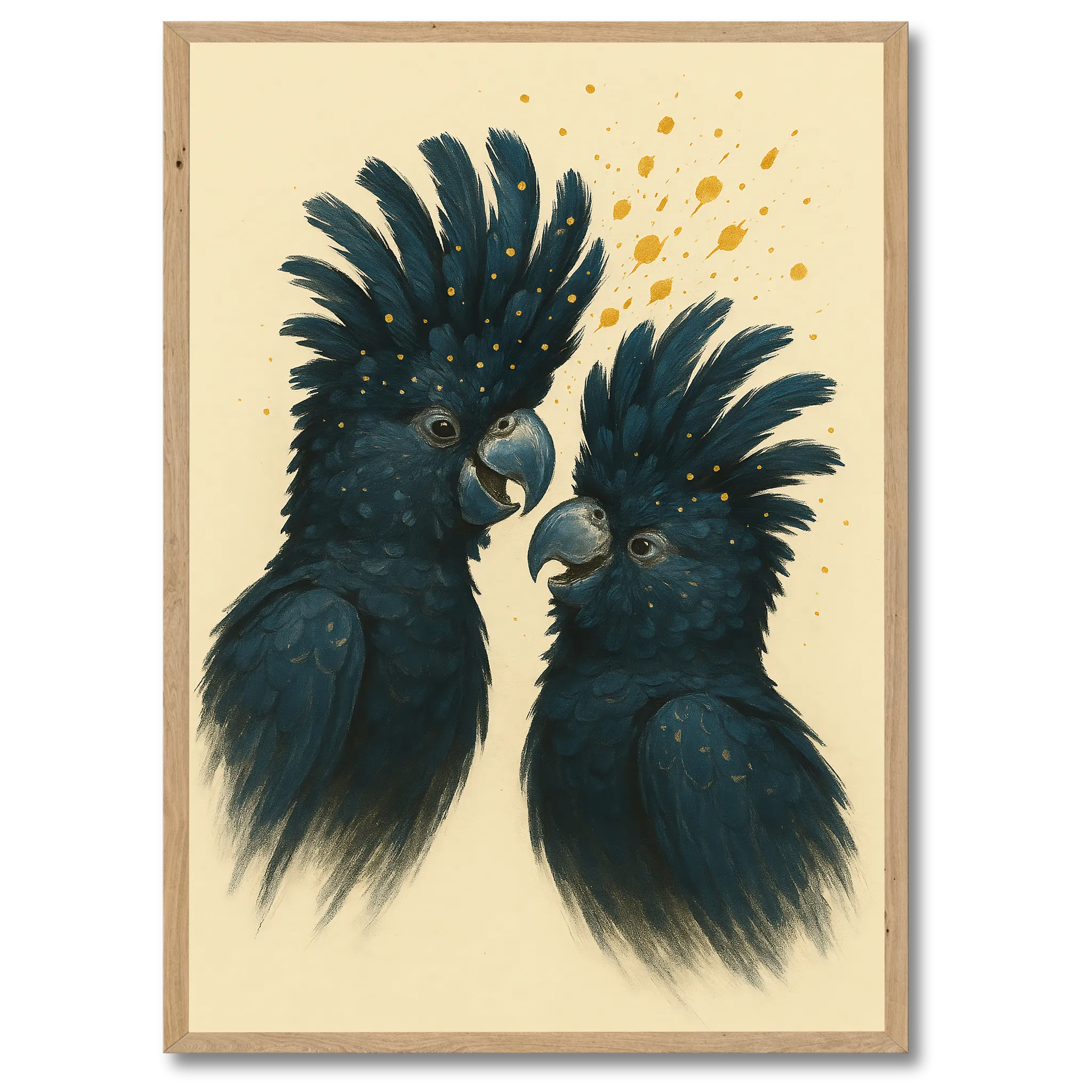 De to kakaduer står som kontraster til hinanden – men samtidig i harmoni. Den ene fremstår stærk og dramatisk, den anden mere let og elegant. Tilsammen skaber de en balance, der giver plakaten liv og dybde. Der er både bevægelse og ro, styrke og lethed. Det er netop denne dualitet, der gør plakaten interessant at se på igen og igen.