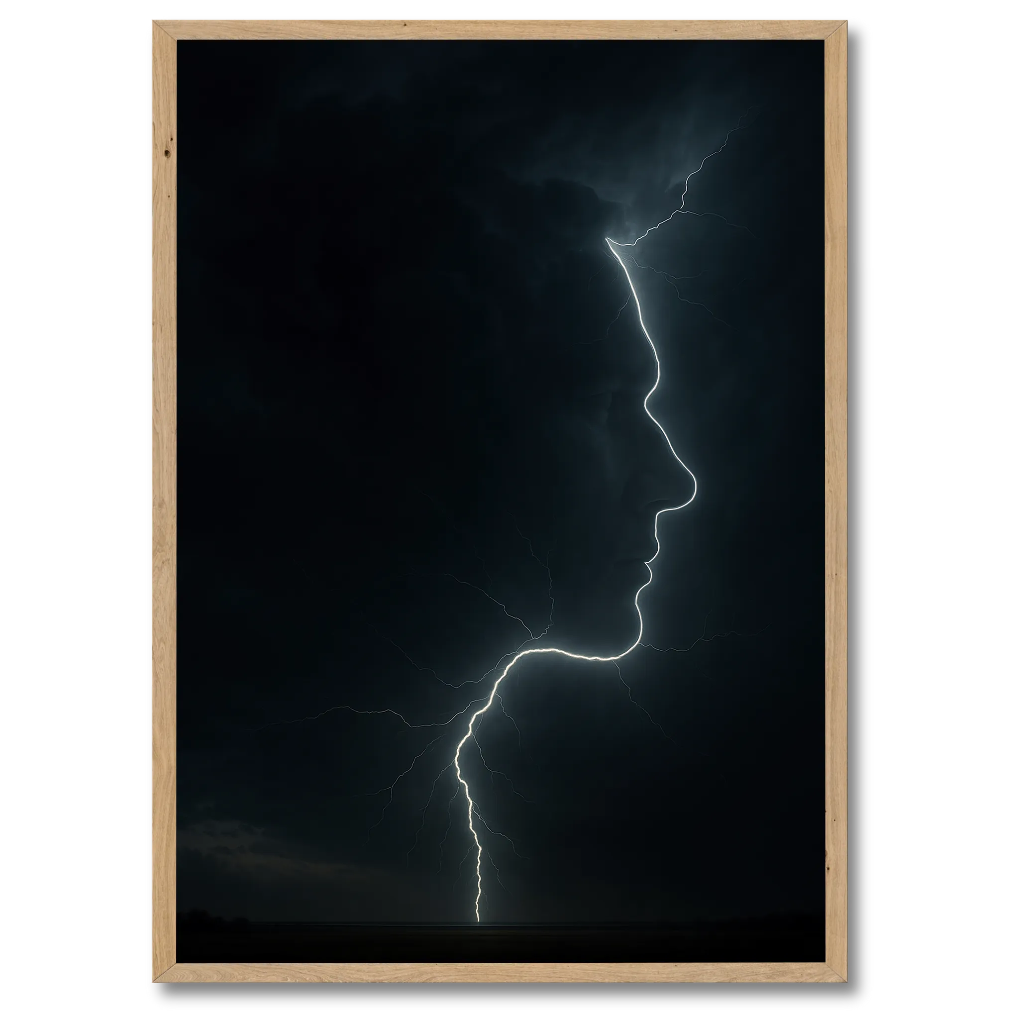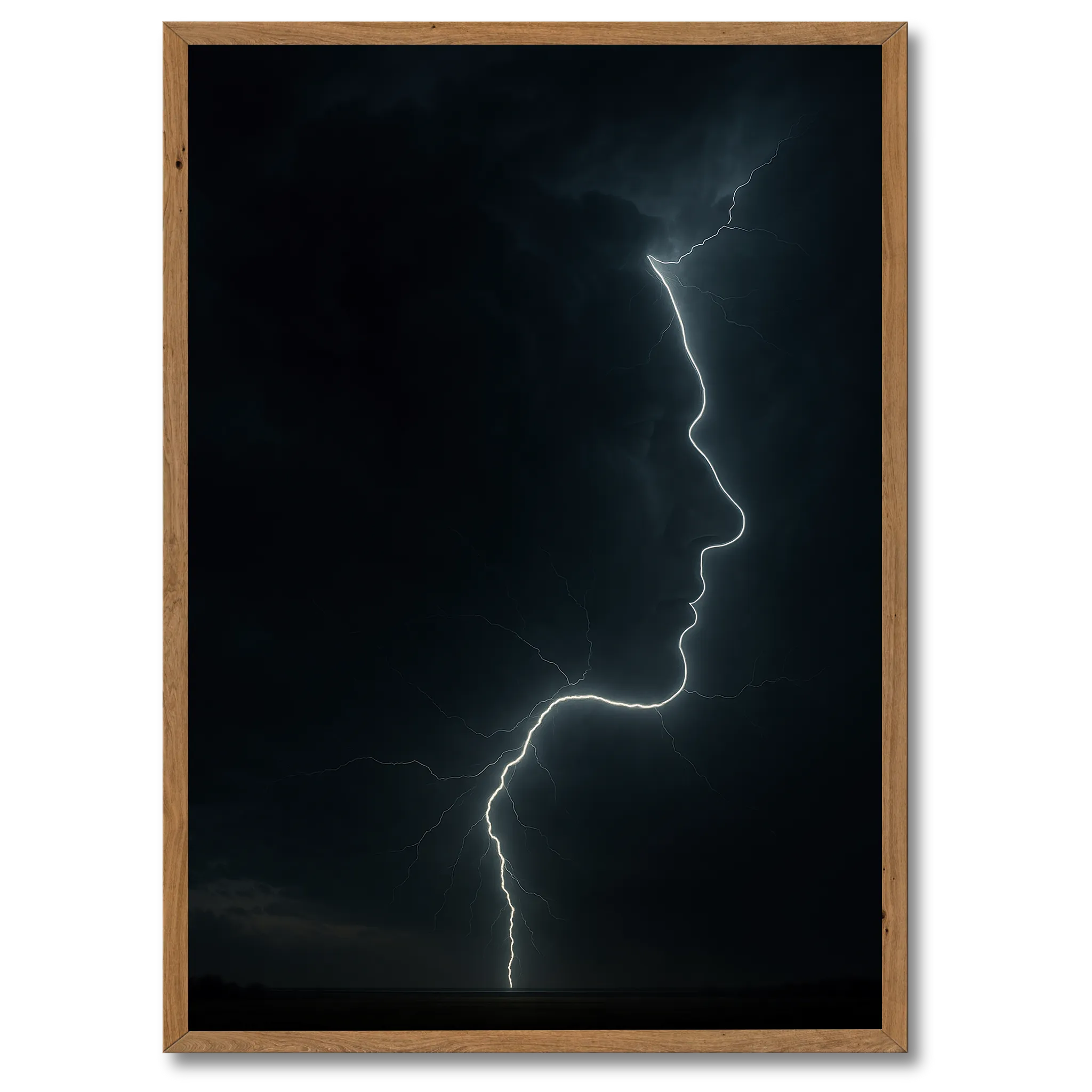 Lynet er et gammelt symbol på energi, transformation og styrke. I denne plakat får det et menneskeligt præg, der skaber en forbindelse mellem naturens kræfter og vores egen indre styrke. Ansigtet i profilen kan tolkes på mange måder – som et symbol på identitet, på indre kraft eller måske endda på sjælens gnist. Det er en plakat, der inviterer til refleksion, og som gør ethvert rum mere levende.