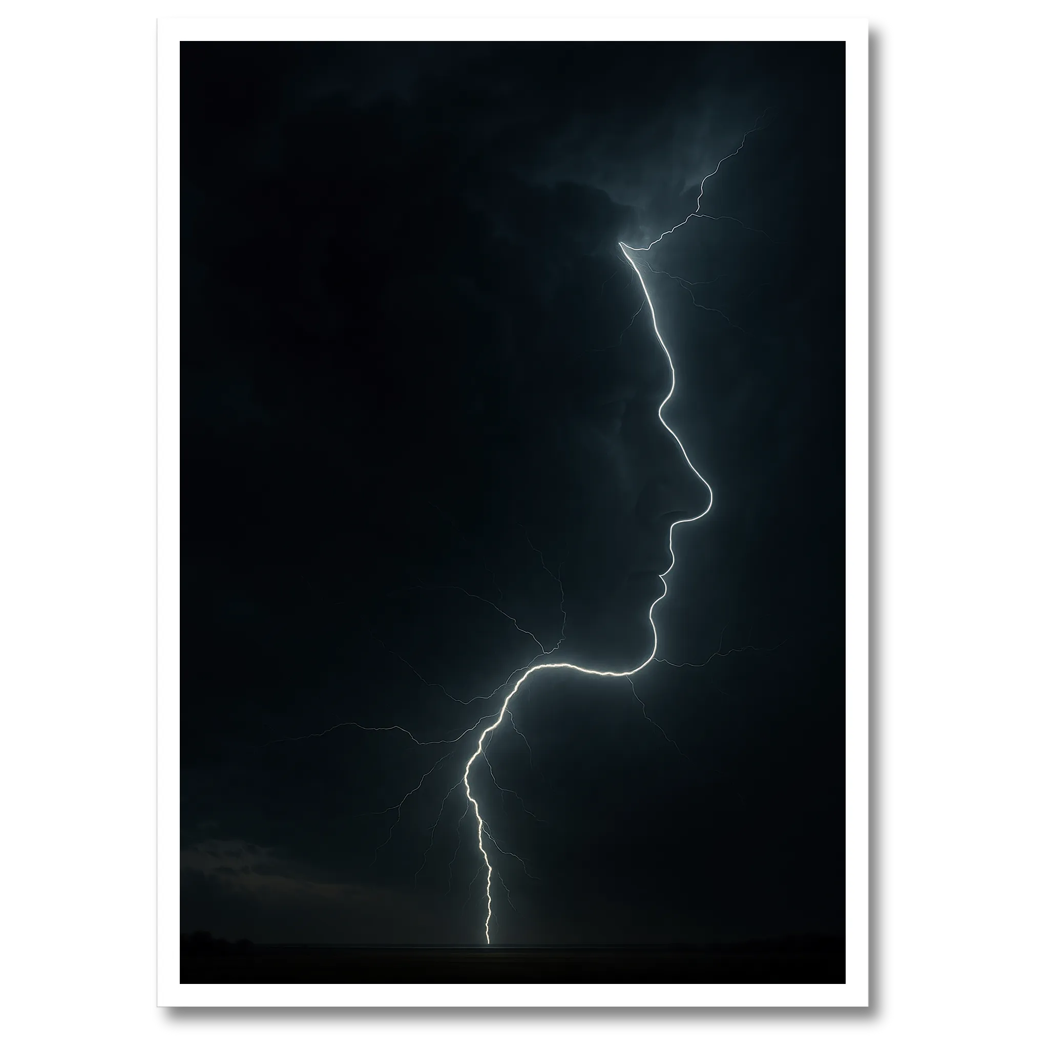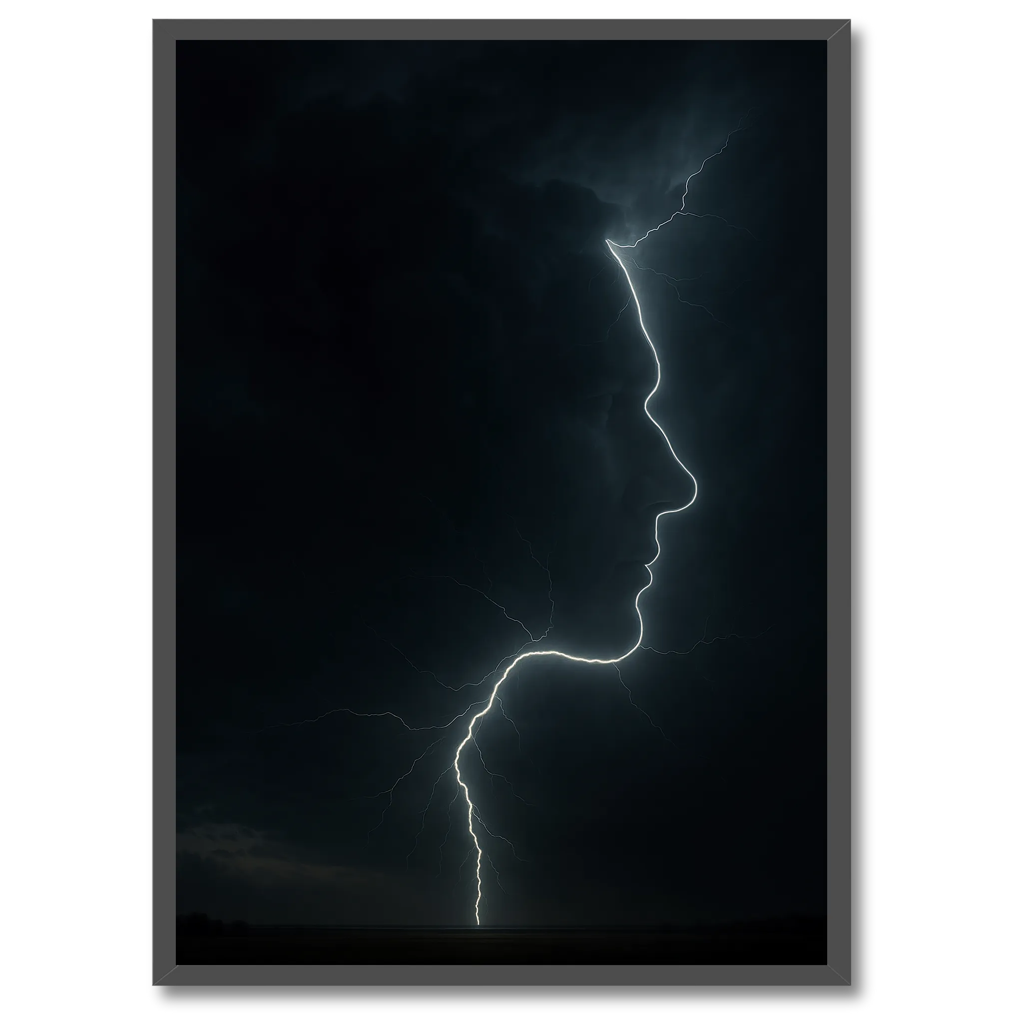 Kontrasten mellem mørke og lys er det, der giver plakaten dens intensitet. Den mørke baggrund understreger lynets klare streger, så ansigtets profil næsten synes at lyse. Når du hænger den op, er det ikke bare en dekoration – det er et stykke kunst, der skaber stemning. Den kan give ro, fordi den er enkel i sit udtryk, men også energi, fordi lynet stråler af bevægelse og kraft.