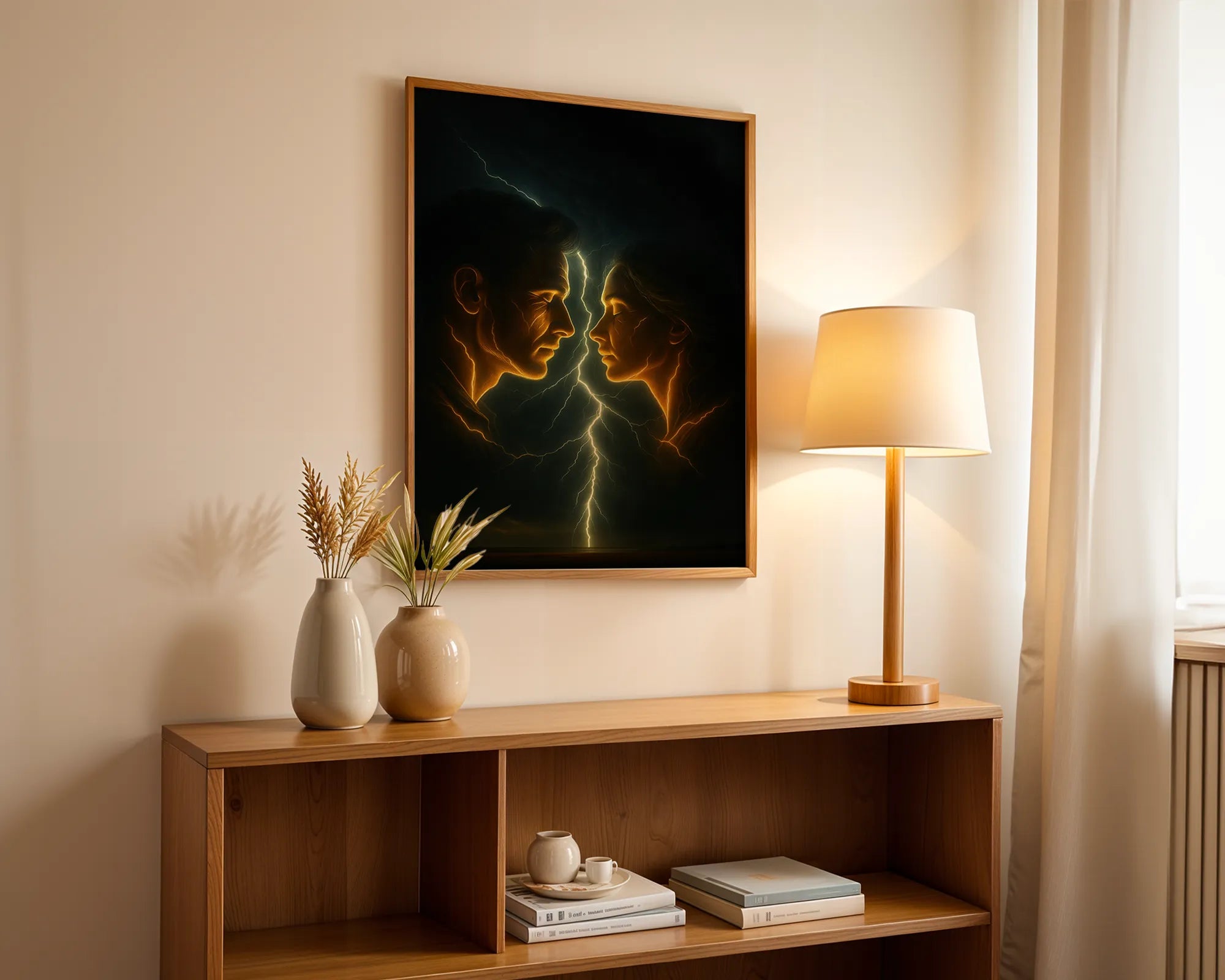 Lightning Kiss plakat er til dig, der vil have mere end bare dekoration. Den er til dig, der ønsker kunst, der fortæller en historie, og som vækker følelser. Til dig, der tør vise romantik på en ny måde. Og til dig, der vil have et hjem, hvor kunsten ikke bare pynter – men siger noget.
