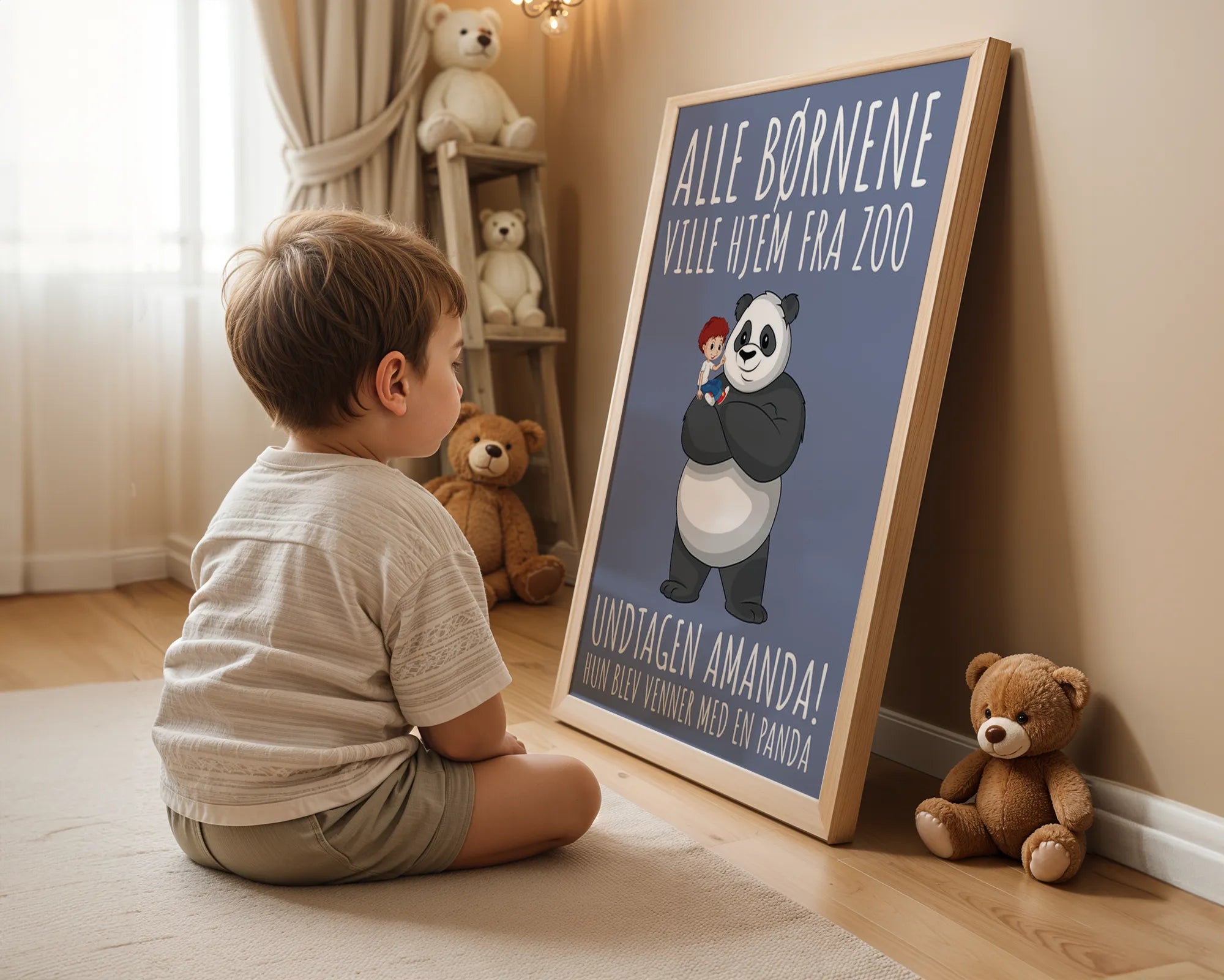 Her får du en sød og sjov plakat med en af de velkendte "Alle børnene" jokes formuleret på en sød og venlig måde med en rigtig sød tegning til. Her er det Amanda, som er blevet så gode venner med en panda, at hun slet ikke har lyst til at tage hjem fra Zoo.