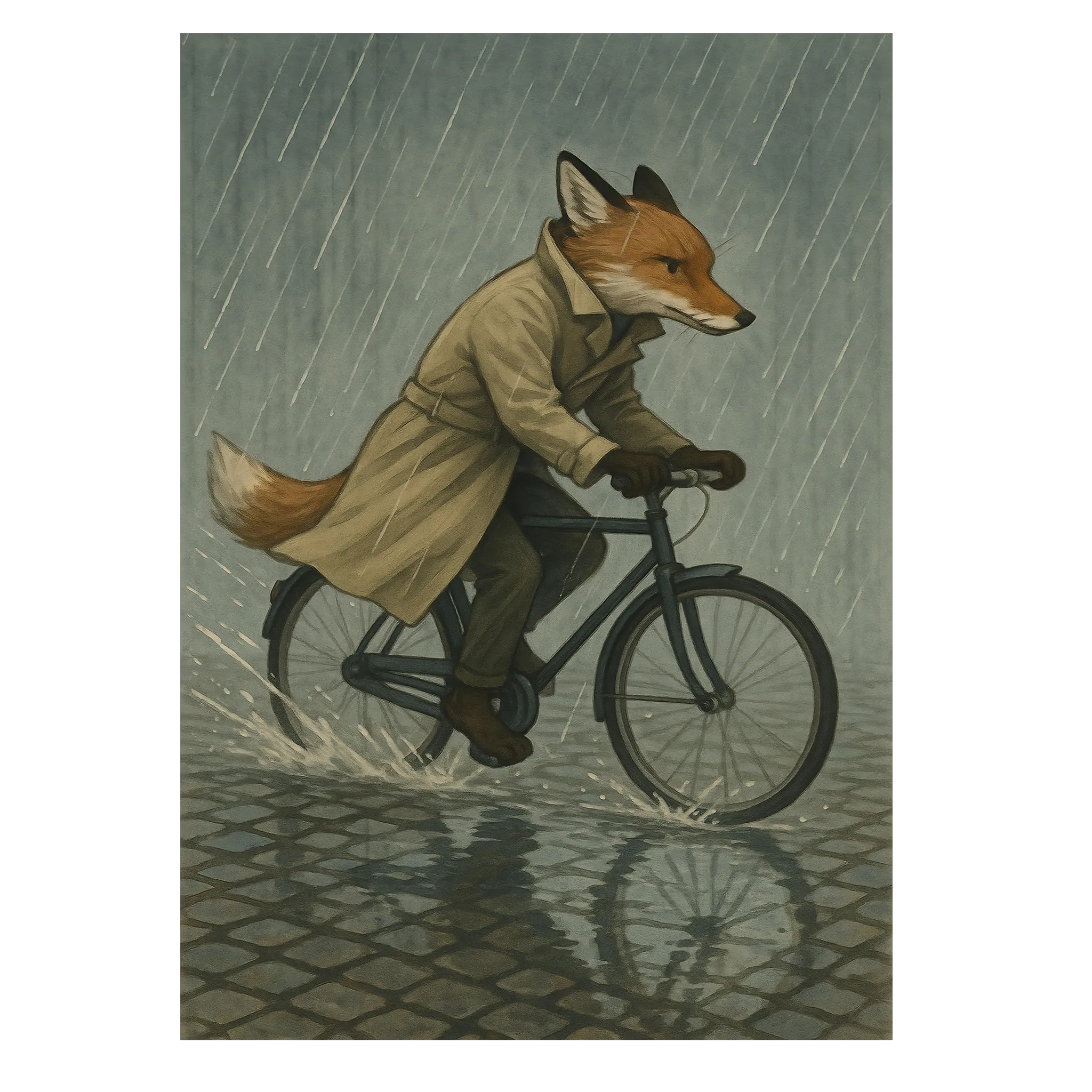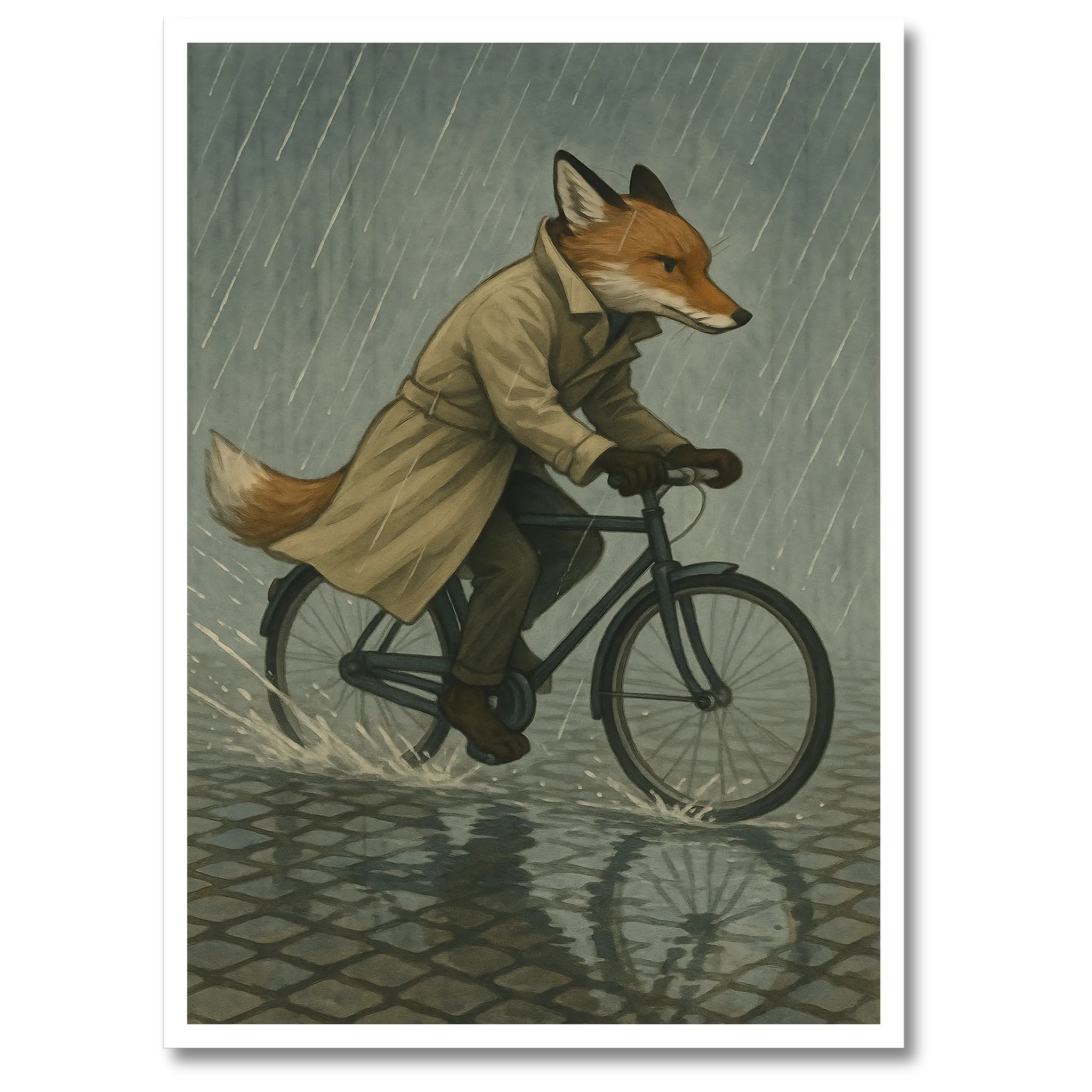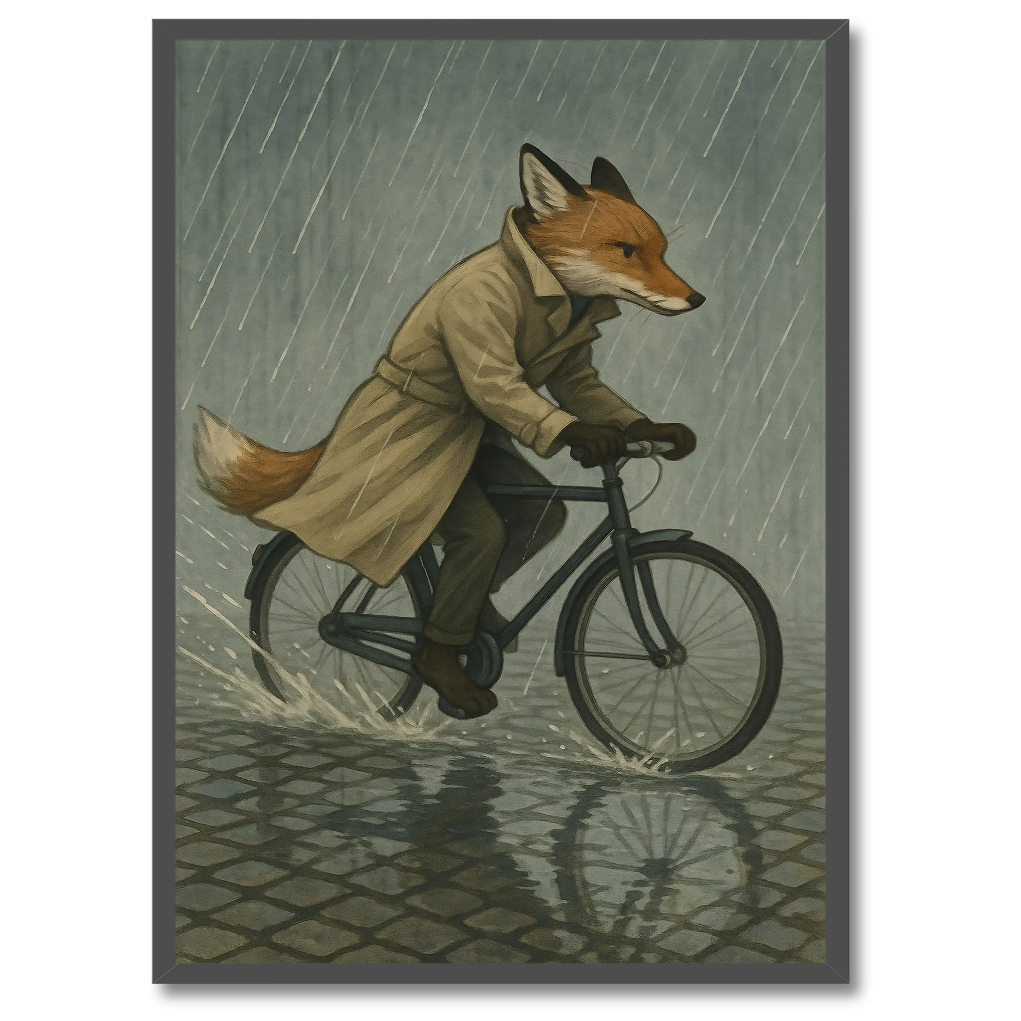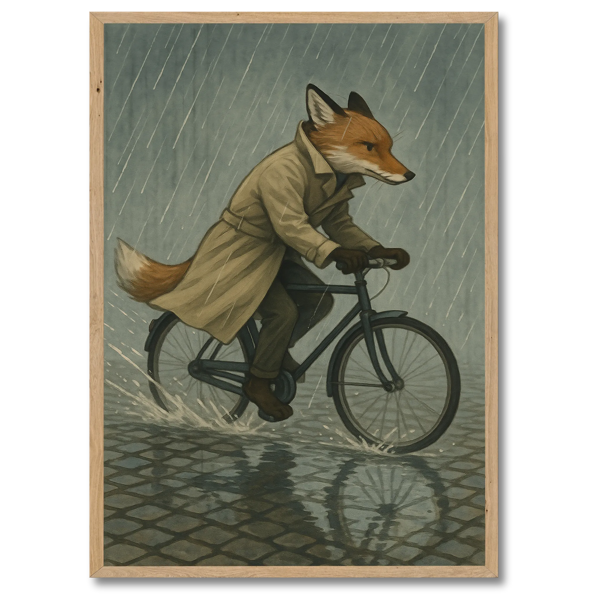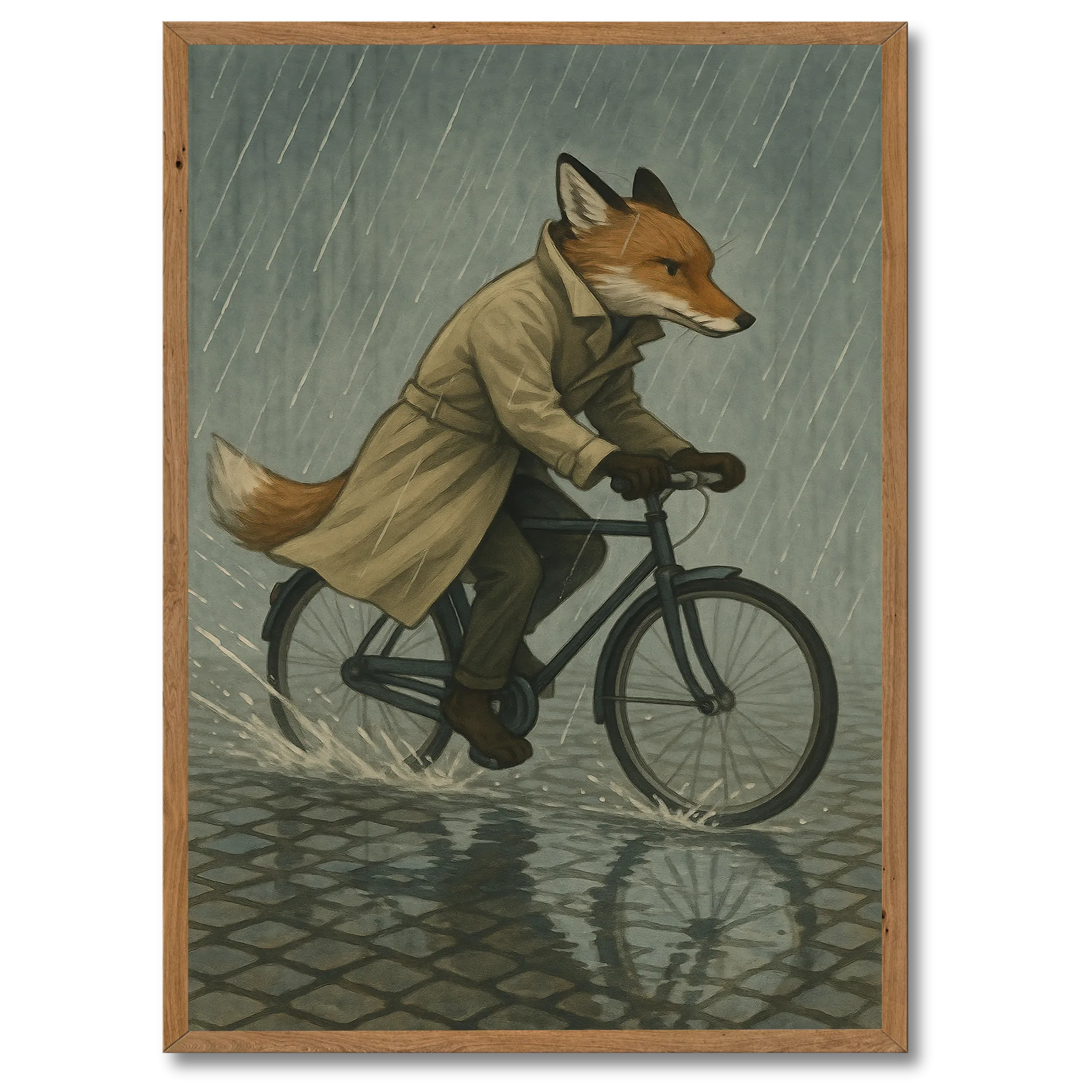 Illustrationen er rig på detaljer. Fra regndråbernes rytme til rævens rolige blik – alt er skabt med sans for stemning. Cyklen, der er både enkel og ikonisk, understøtter motivet, så det fremstår både humoristisk og stilrent på samme tid. Farverne er bløde og stemningsfulde, hvilket gør plakaten nem at kombinere med forskellige indretninger.