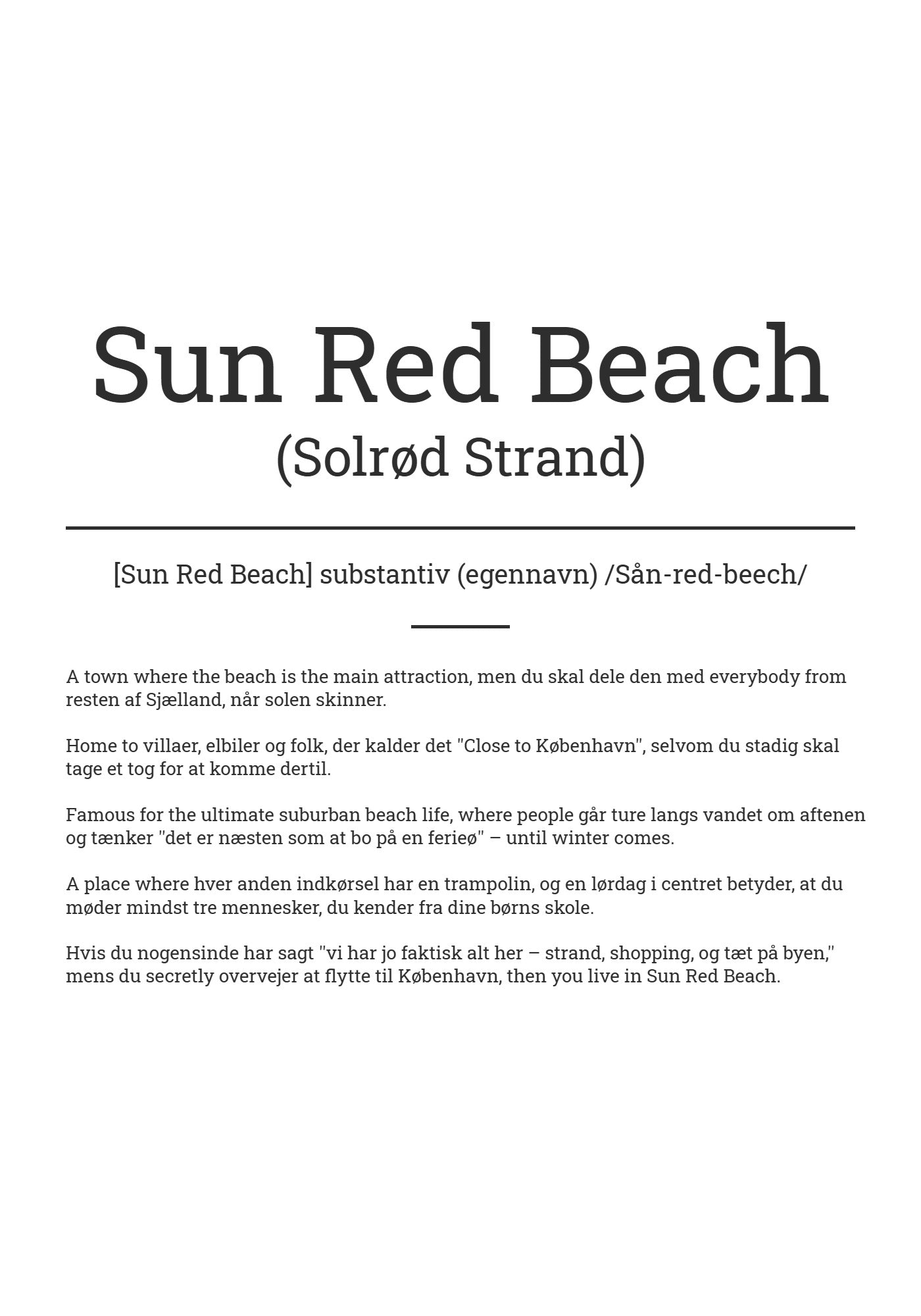 Når man kigger på denne Solrød Strand byplakat, er det tydeligt, at der er tænkt over tingene. Designet er enkelt, typografien står skarpt, og helhedsindtrykket er roligt og velbalanceret.
