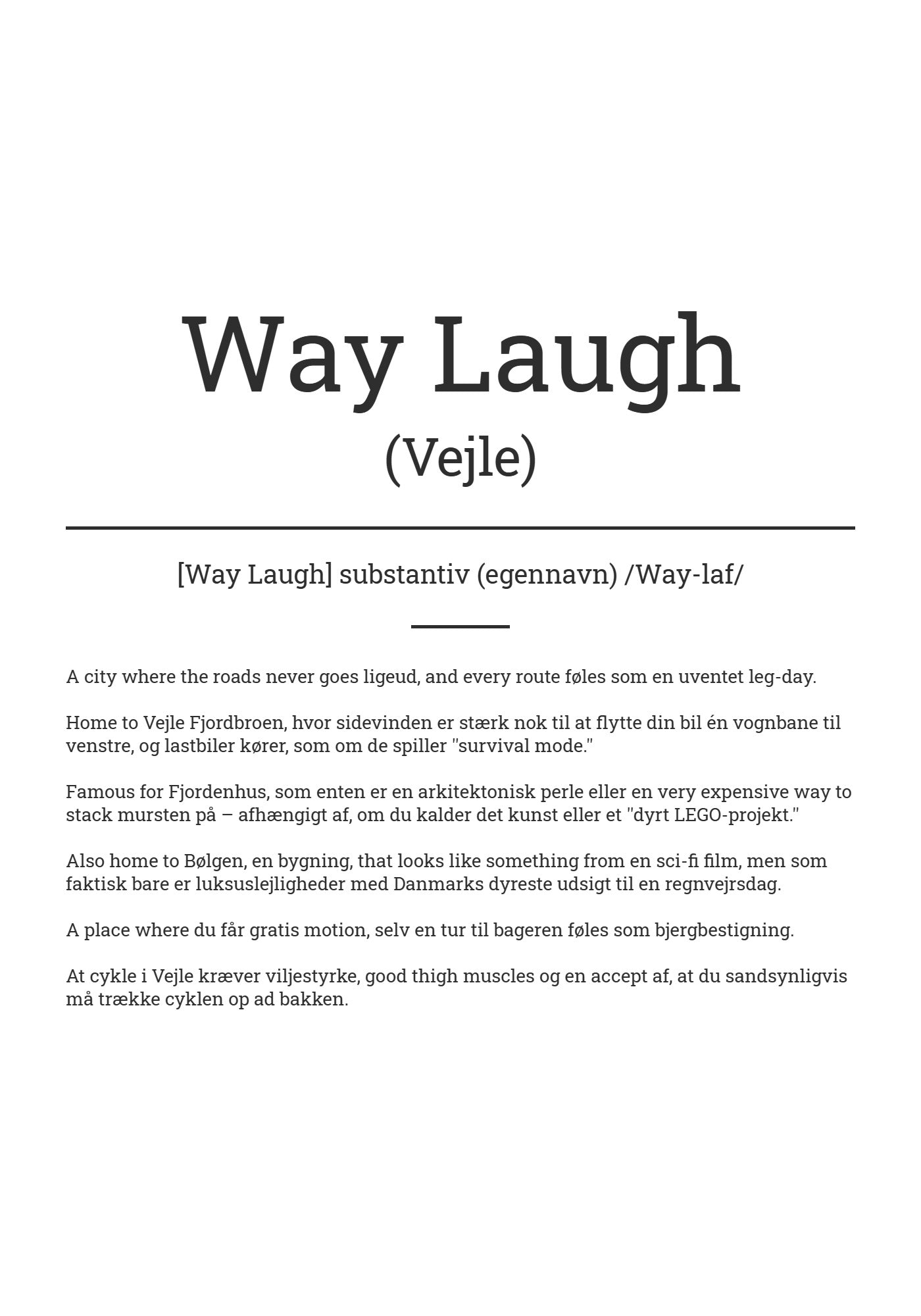 Kender du én, der er fra Vejle? Én der elsker sprog, design og ting, der ikke tager sig selv alt for alvorligt? Så er denne sjove byplakat en gave, der stikker ud.