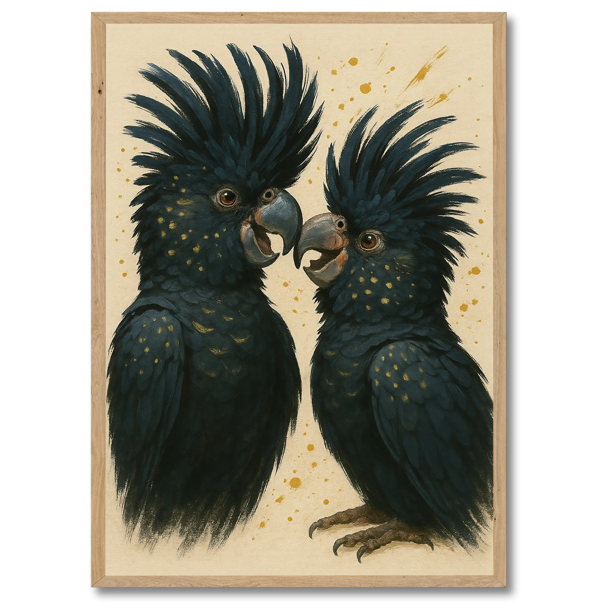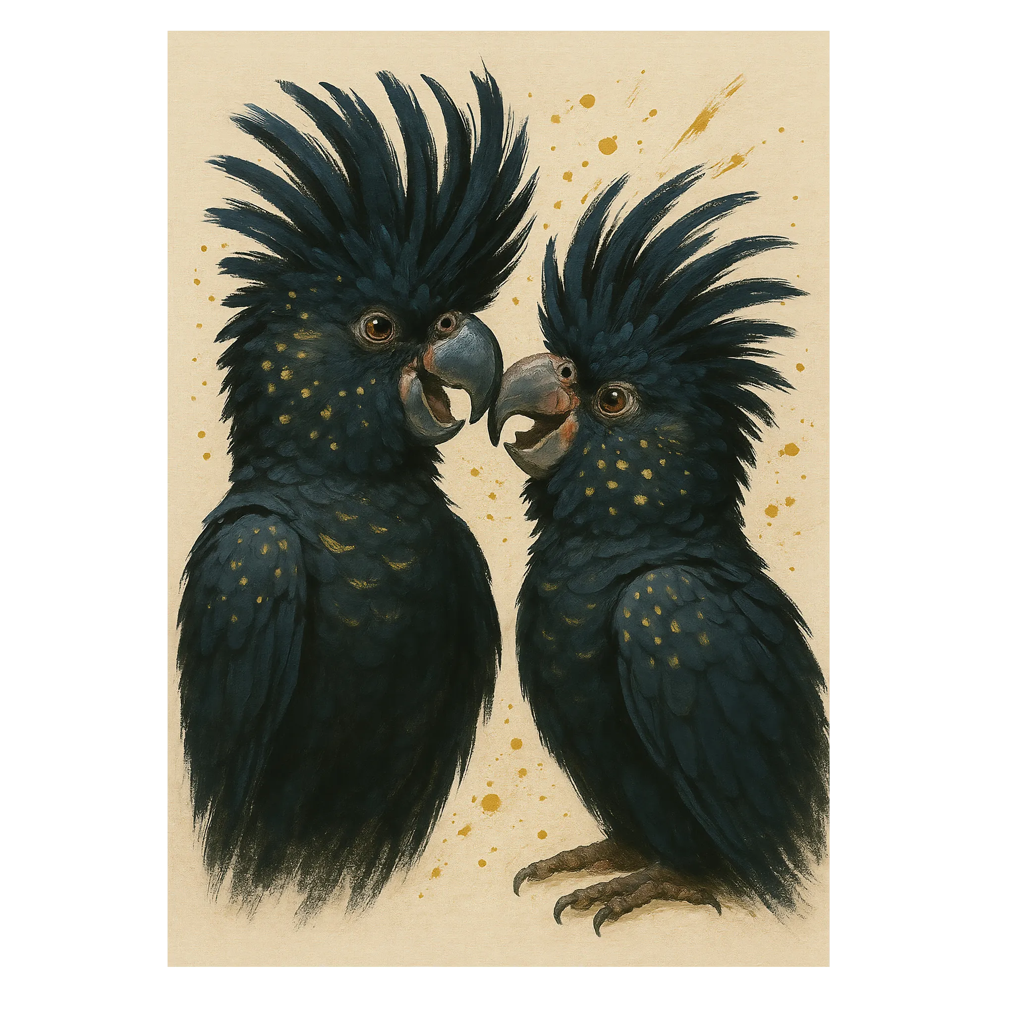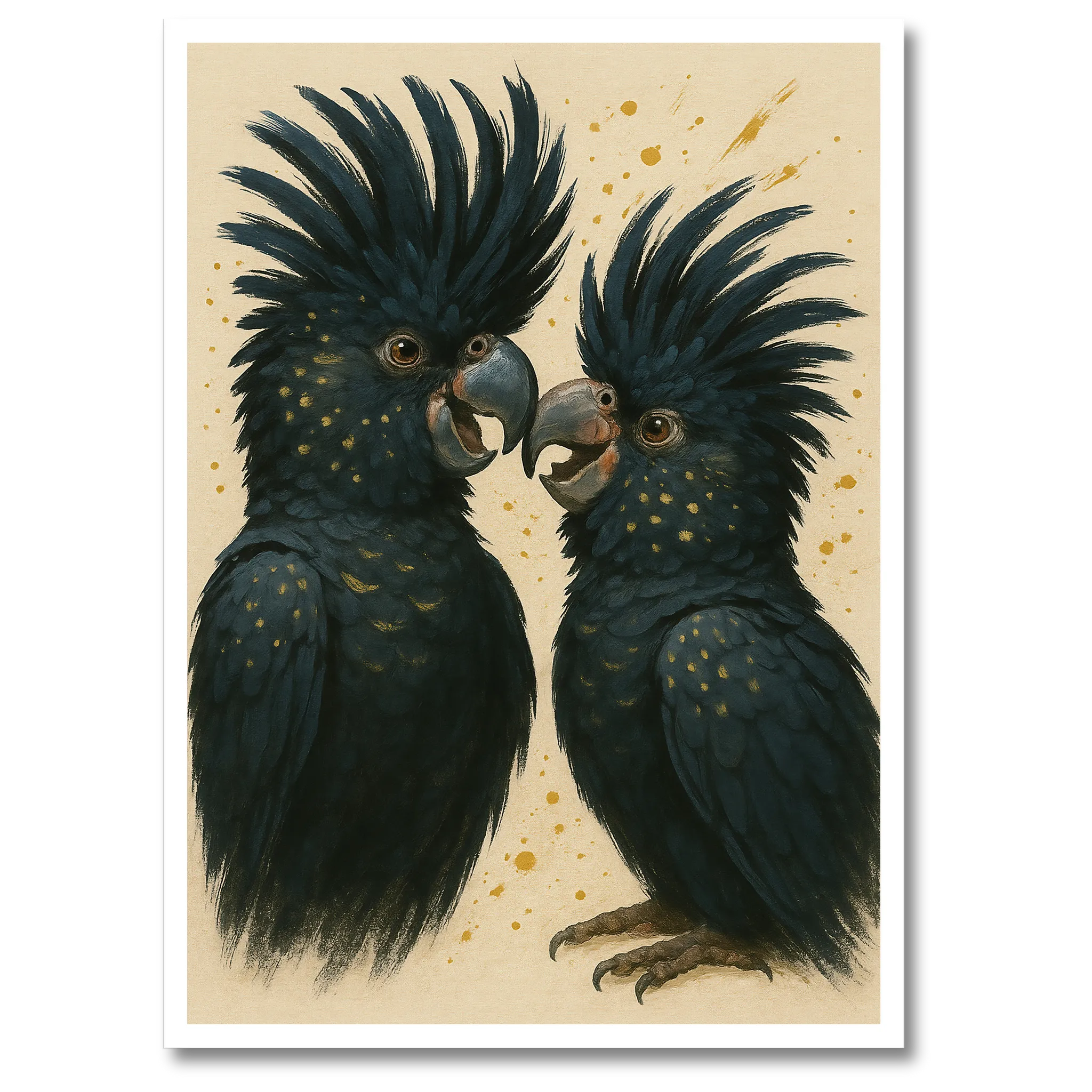 Sorte kakaduer er kendt for deres dramatiske udseende, og i denne illustration står det særligt klart. De sorte fjer med glimt af farver giver en følelse af dybde og intensitet, mens fuglenes kraftfulde silhuet understreger styrke og frihed. Motivet er detaljeret, men samtidig stilrent, hvilket gør det nemt at kombinere med andre plakater eller lade det stå alene som blikfang.
