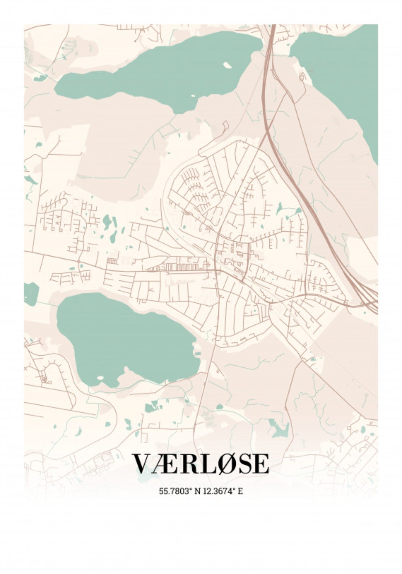 Få en byplakat med Værløse op på væggen. Den moderne stil og de forskellige farvemuligheder sikre, at plakaten passer ind i et hvilket som helst hjem eller kontorlokale.